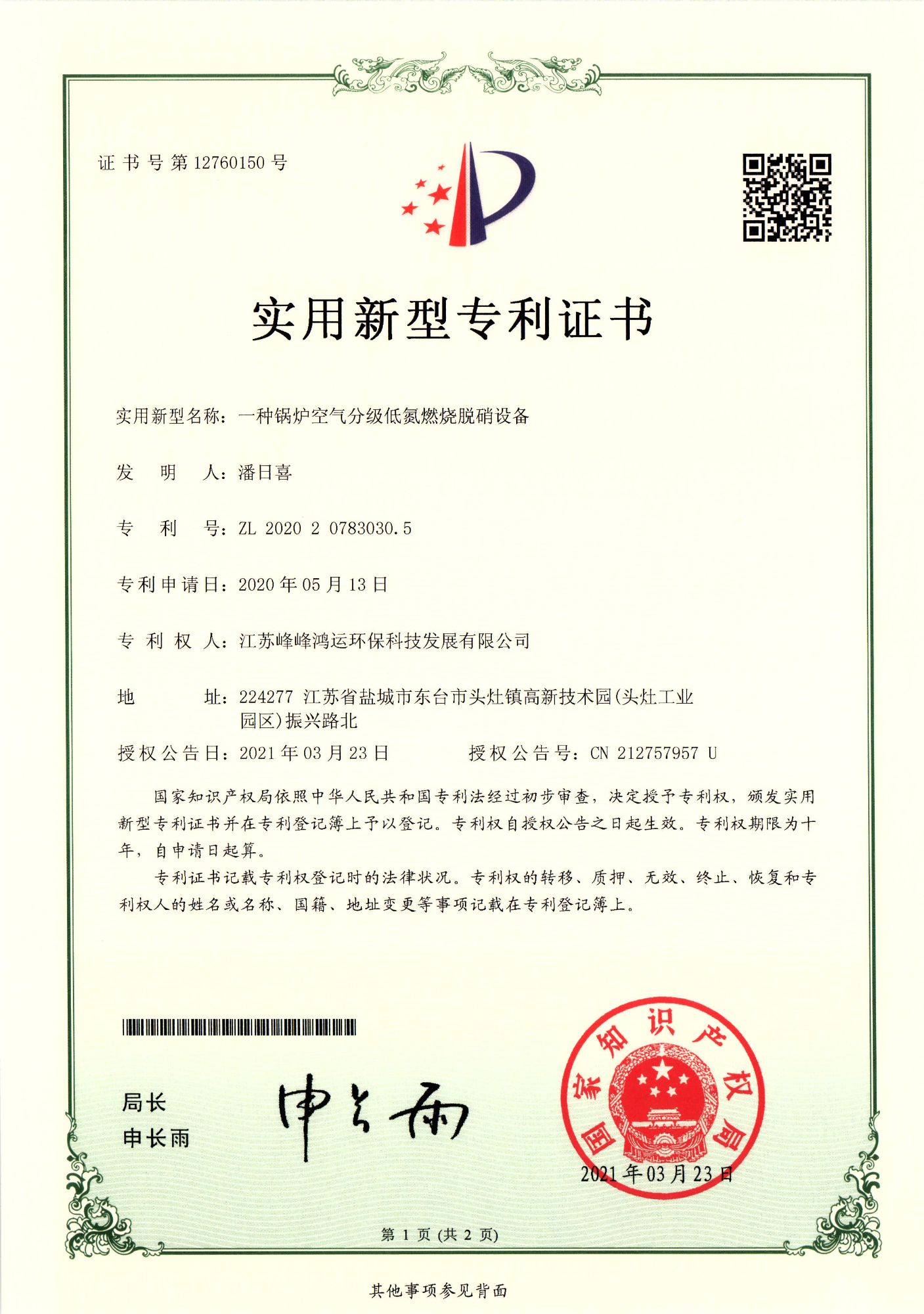 实用新型专利证书
